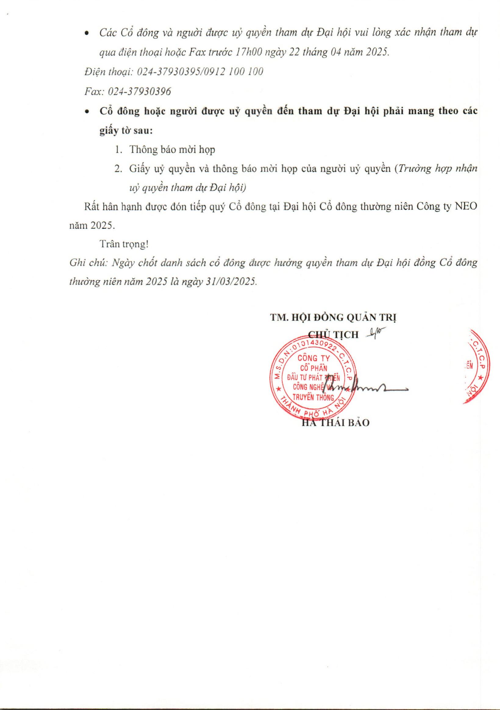 THÔNG BÁO MỜI HỌP ĐHĐCĐ THƯỜNG NIÊN CÔNG TY NEO 2025