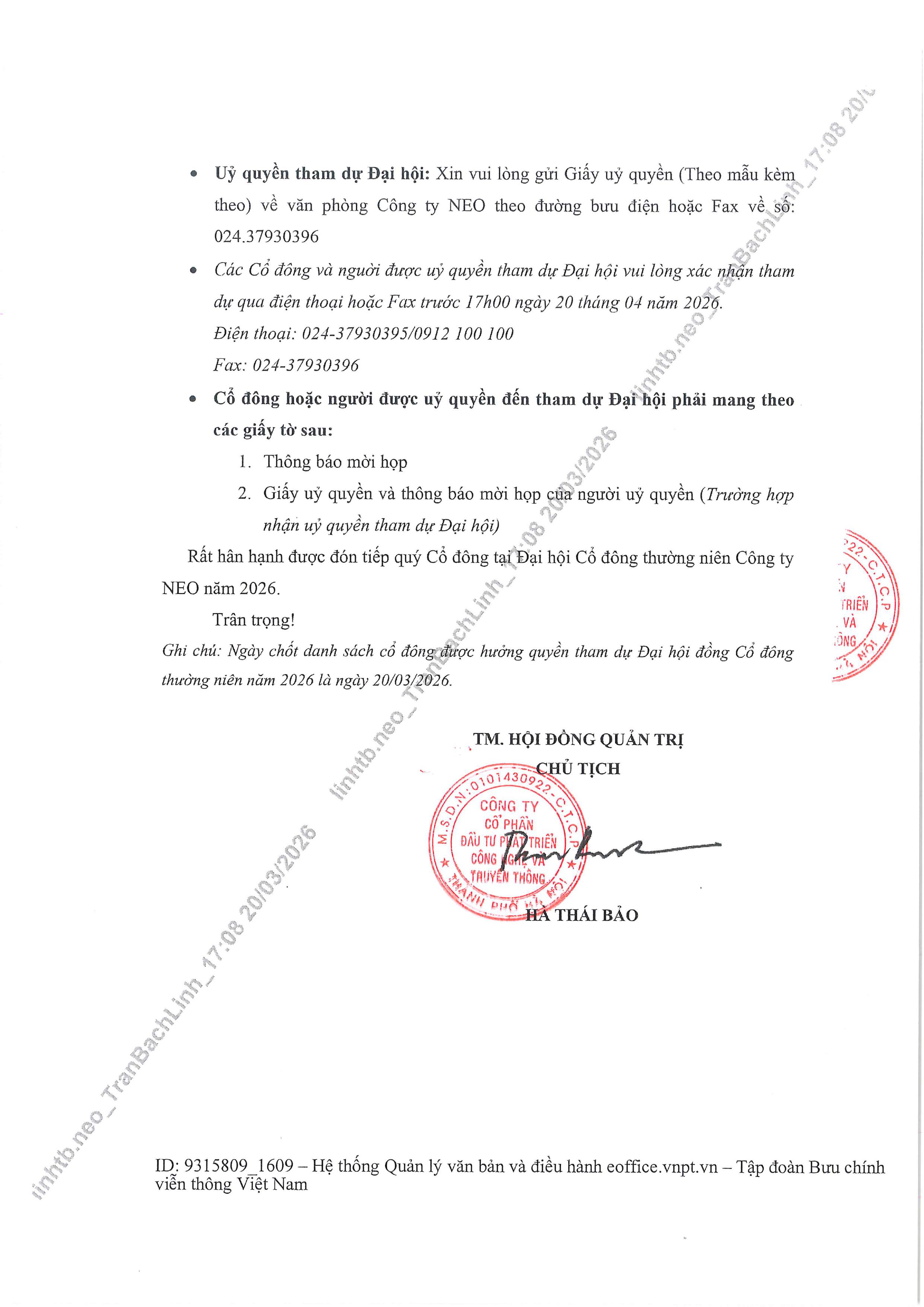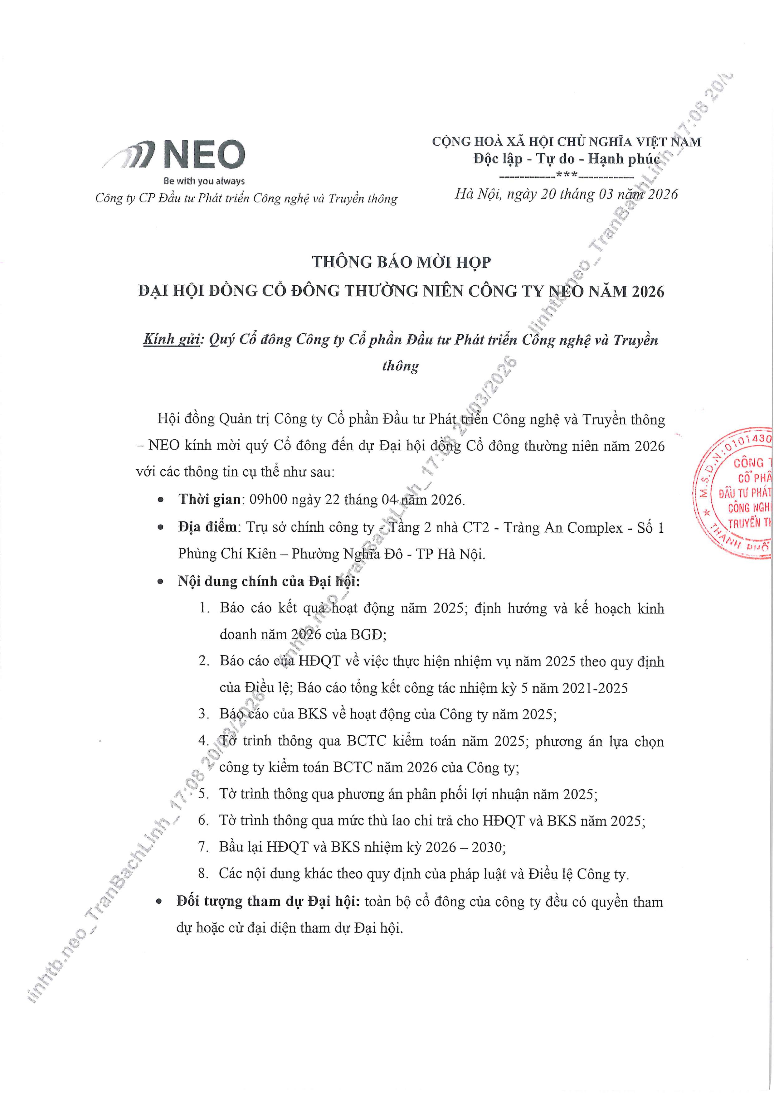 THÔNG BÁO MỜI HỌP ĐHĐCĐ THƯỜNG NIÊN CÔNG TY NEO 2026